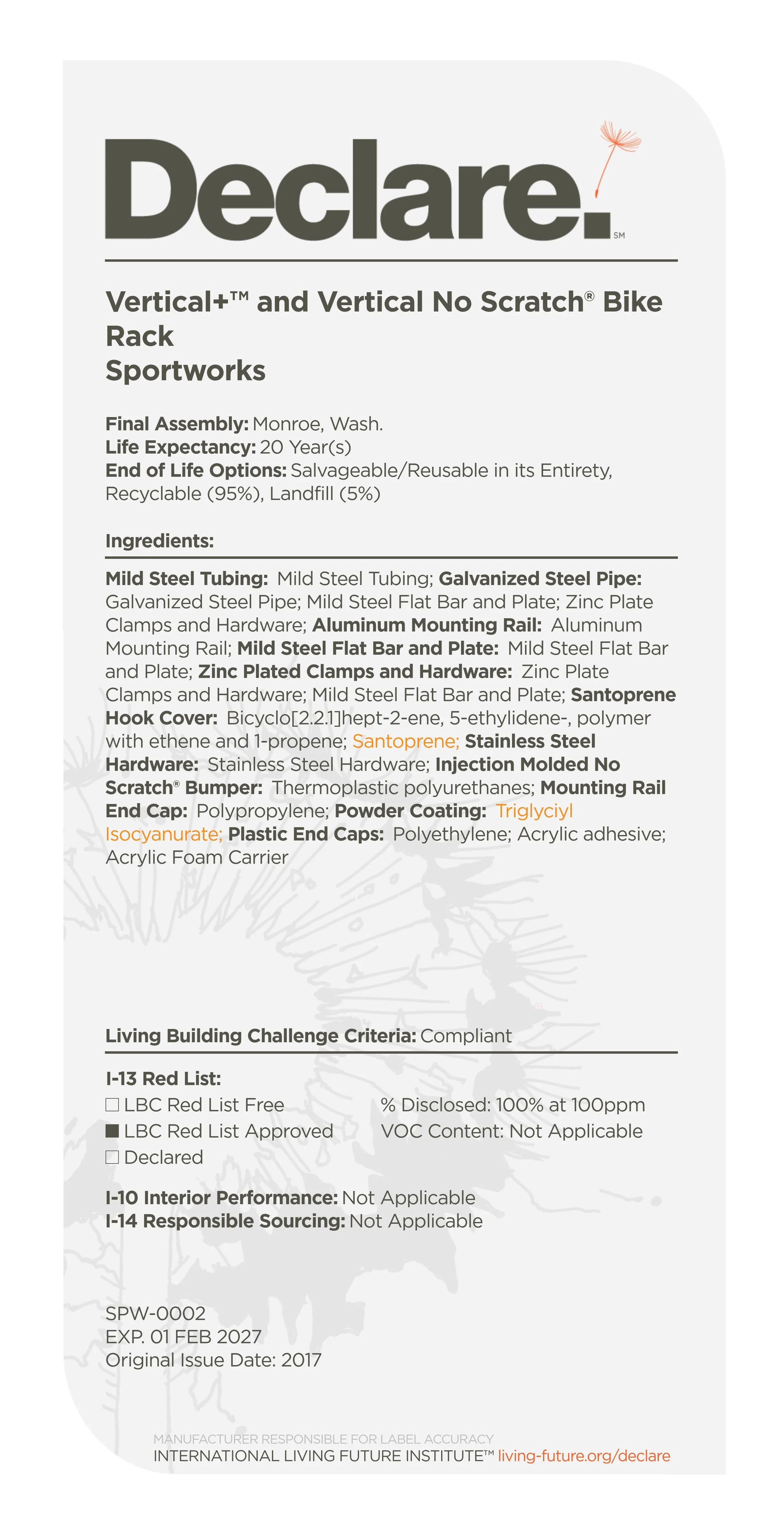 In 2014, Sportworks became Declare Certified as part of our commitment to sustainable practices. Our No Scratch™ Bike Parking Racks and Vertical+ Bike Parking Racks are all Declare Certified. These racks include the Tofino, Oahu, Westport, Vertical+ Floor System, Vertical+ Wall System, and Vertical+ Direct Wall Mount.
